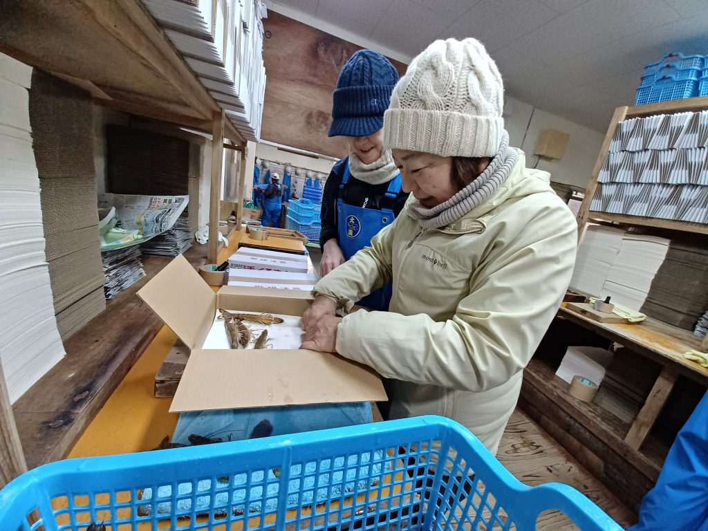 私が担当したのは、出荷に向けての活き車えびの箱詰め作業。養殖場から水揚げされたえびは、特大から極小まで大きさで分けられ、サイズごとに1キロずつ箱詰めしていく。箱の底に柔らかいシートを敷き、時々暴れるえびをそっと押さえながら向きをそろえて詰めていく。さらに上からシートで包み、すき間には新聞紙をクシャっと丸めて詰めて固定。えびの数は箱ごとに違うので、箱の外側には数を記さなければならない。立ちっぱなしで、しゃべる暇はない。というより、しゃべっている場合ではない。みんなの頭の中は、えびの数を高速で数えている。私も「に、し、ろっぱ…」と間違えないよう全集中。手早さと丁寧さが肝心だ。